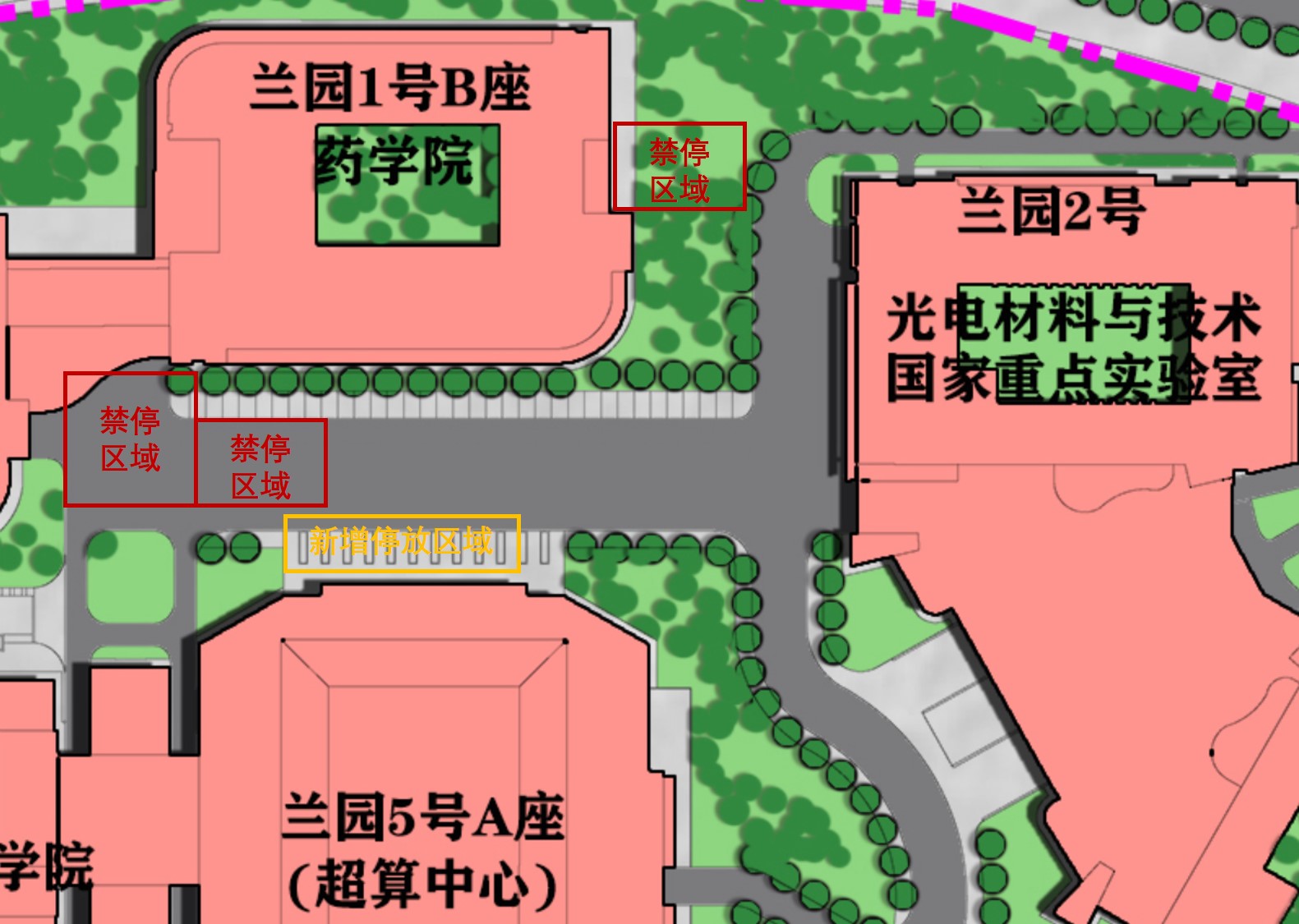 学院大楼西南门及东门外为消防通道,禁止停放电动自行车(附图红框区域)。经校园保卫办同意,新增学院大楼南侧与超算中心北侧之间的人行道为电动自行车停放区域(附图黄框区域)。